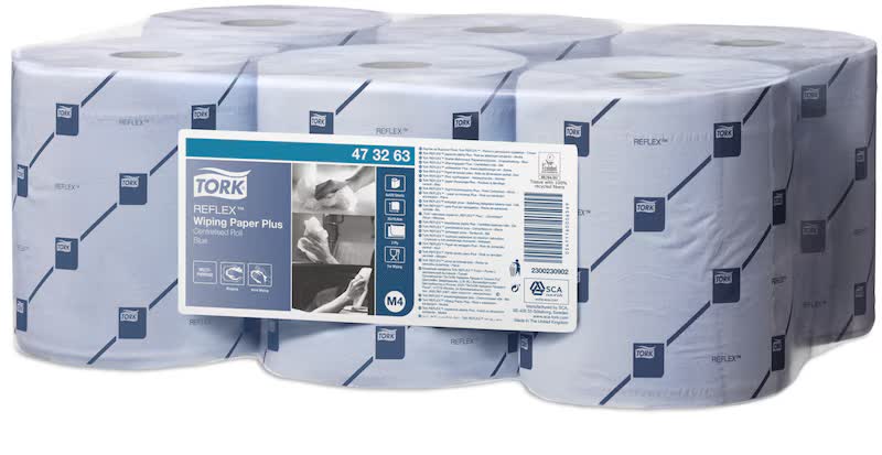 Tork Reflex™ Wiping Paper Plus Blue M4 — 2-ply, 150 m roll, strong and absorbent, ideal for wiping spills and hands. Made from 100% recycled fibres for everyday cleaning in food or industrial setting