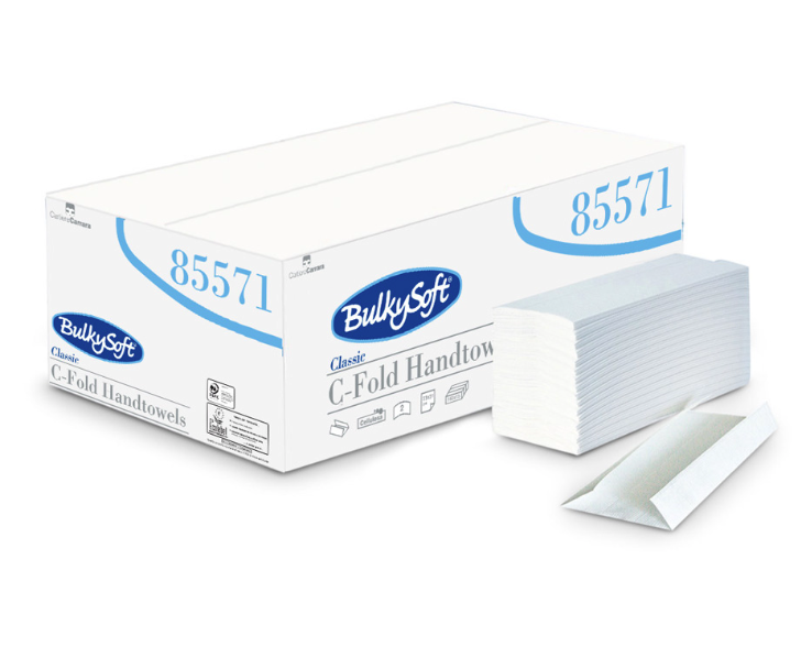 Pallet of Hand Towels, C-Fold, Bulkysoft, 2 Ply White - 2 Ply, embossed, White. Bulk supply for trade and high-traffic sites.