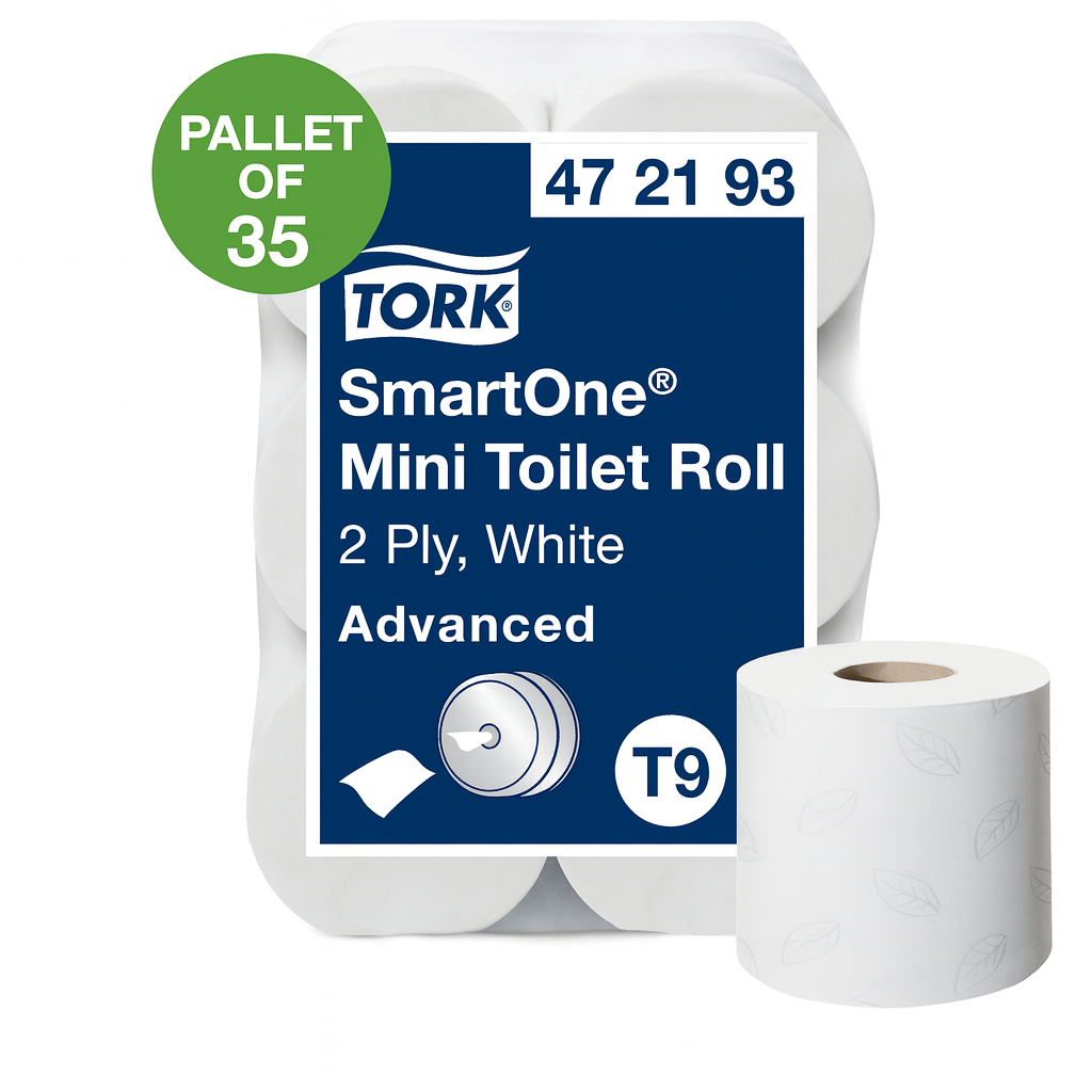 Pallet of Toilet Roll, 2 Ply, Smart One T9, Mini - jumbo, Tork, SmartOne. Bulk supply for trade and high-traffic sites.